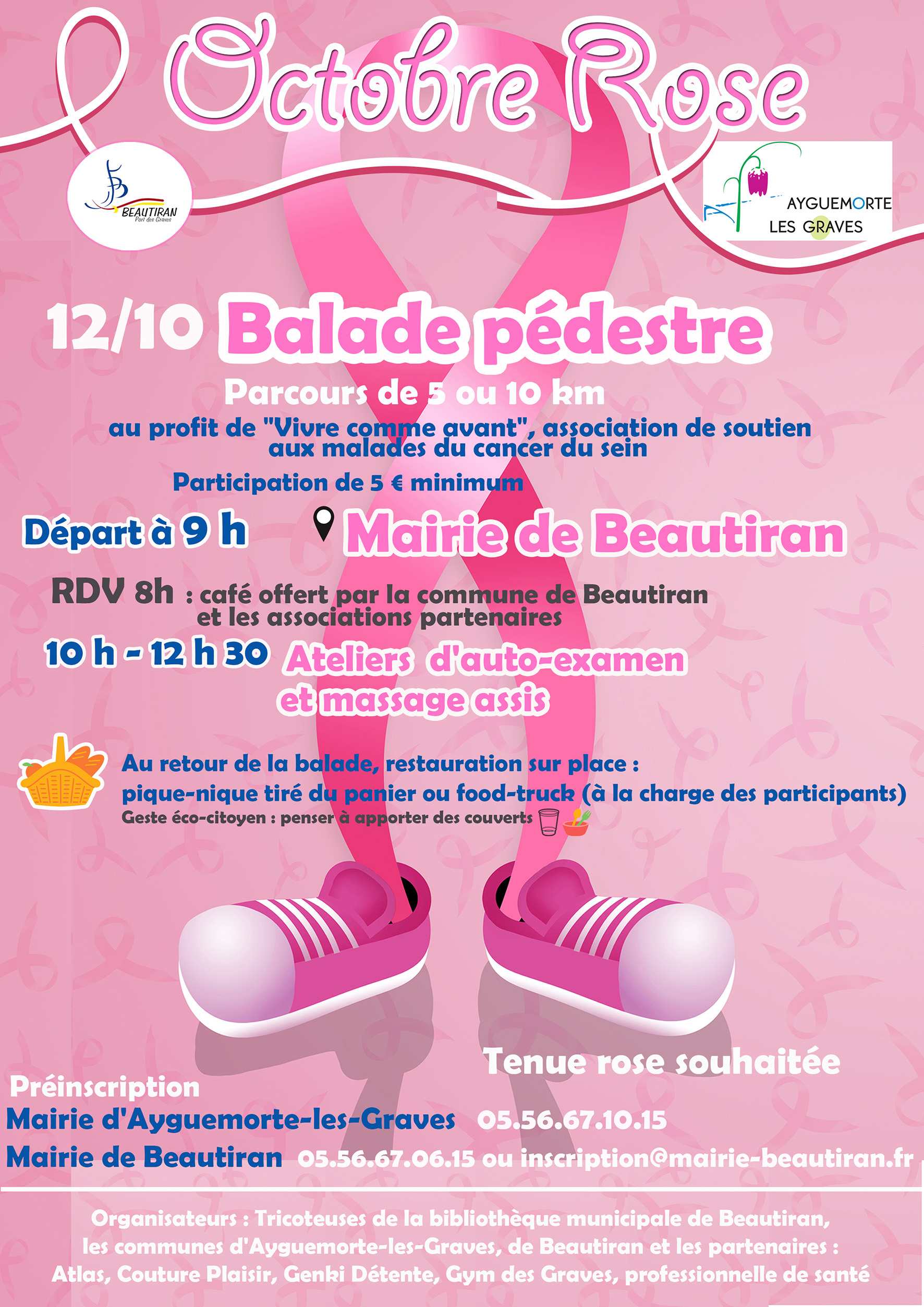 Les communes de Beautiran et d’Ayguemorte-les-Graves ainsi que les tricoteuses de la bibliothèque municipale de Beautiran, en partenariat avec les associations Atlas, Couture Plaisir, Gym des Graves, Genki détente et une professionnelle de santé, organisent, dans le cadre d’Octobre Rose, une balade (encadrée) de 10 km ou de 5 km qui aura lieu dimanche 12 octobre.